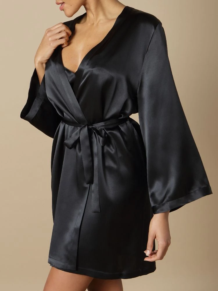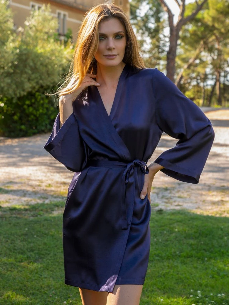 Der kurze Seiden-Morgenmantel Laser der französischen Edel-Marke Marjolaine ist aus feinem Seidensatin (100% Seide) gefertigt. Der hochwertig verarbeitete kurze Morgenmantel ist die perfekte Ergänzung zu den Seiden-Nachthemden und Negligés von Marjolaine.