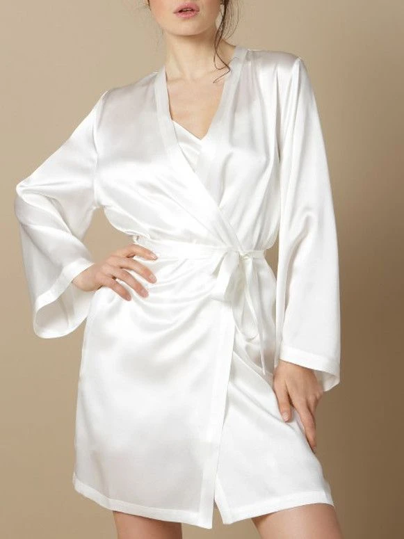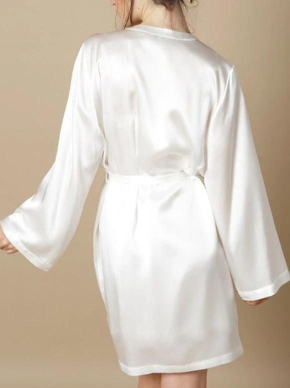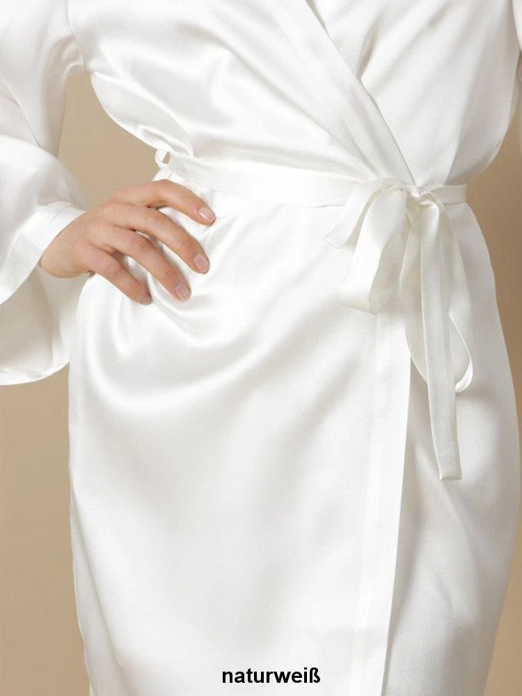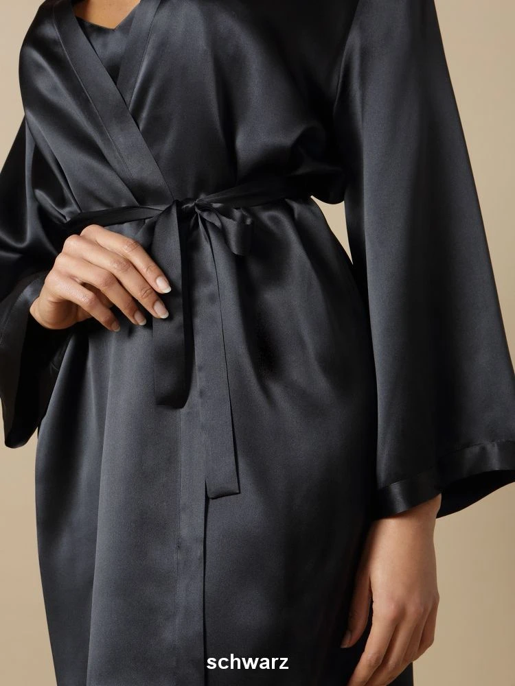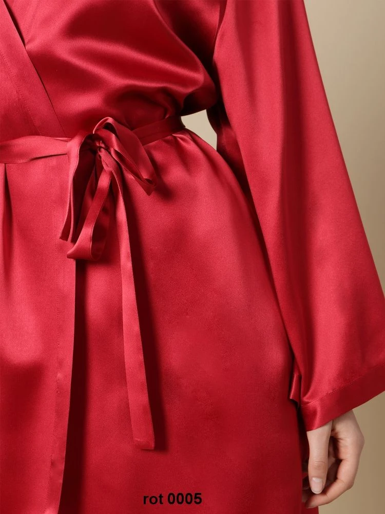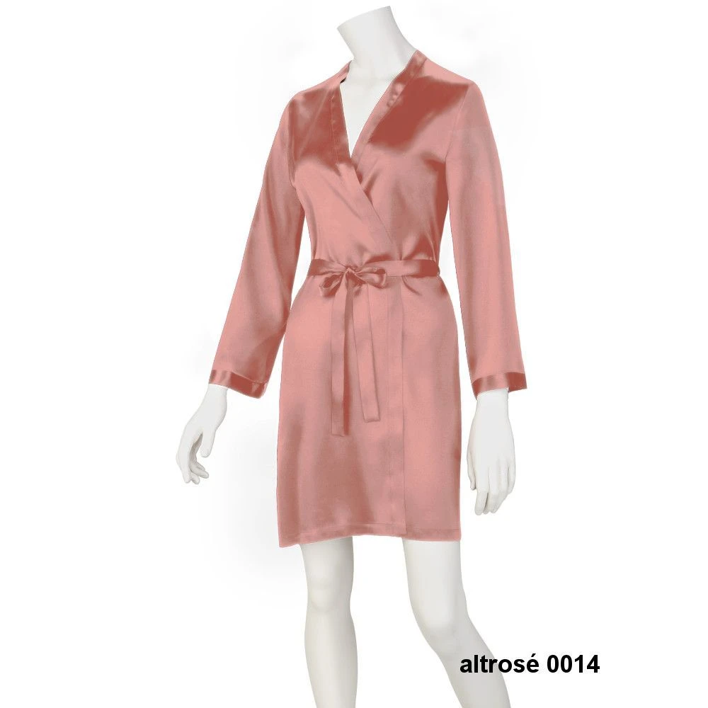 Dieser kurze Seiden-Morgenmantel ist ca. 90 cm lang. Er wird in den Größen 36 bis 46 angeboten (deutsche Damengrößen) und ist in den folgenden Farben erhältlich: