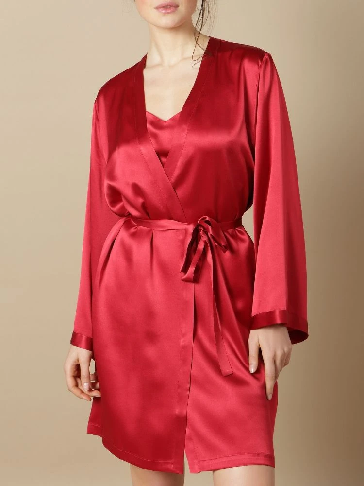 Der kurze Seidenmorgenmantel Laser hat lange Ärmel, ein schmales Revers und wird mit einem Bindegürtel geschlossen. Er ist aus der Basic Kollektion Soie Unie von Marjolaine und in Uni-Farben erhältlich.