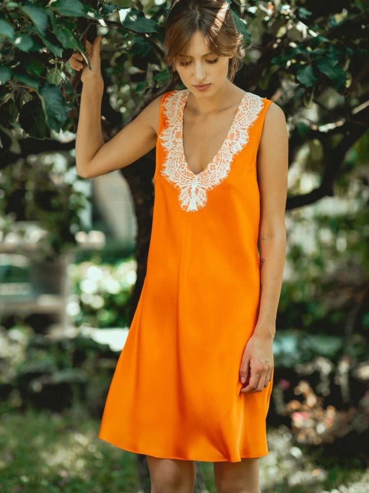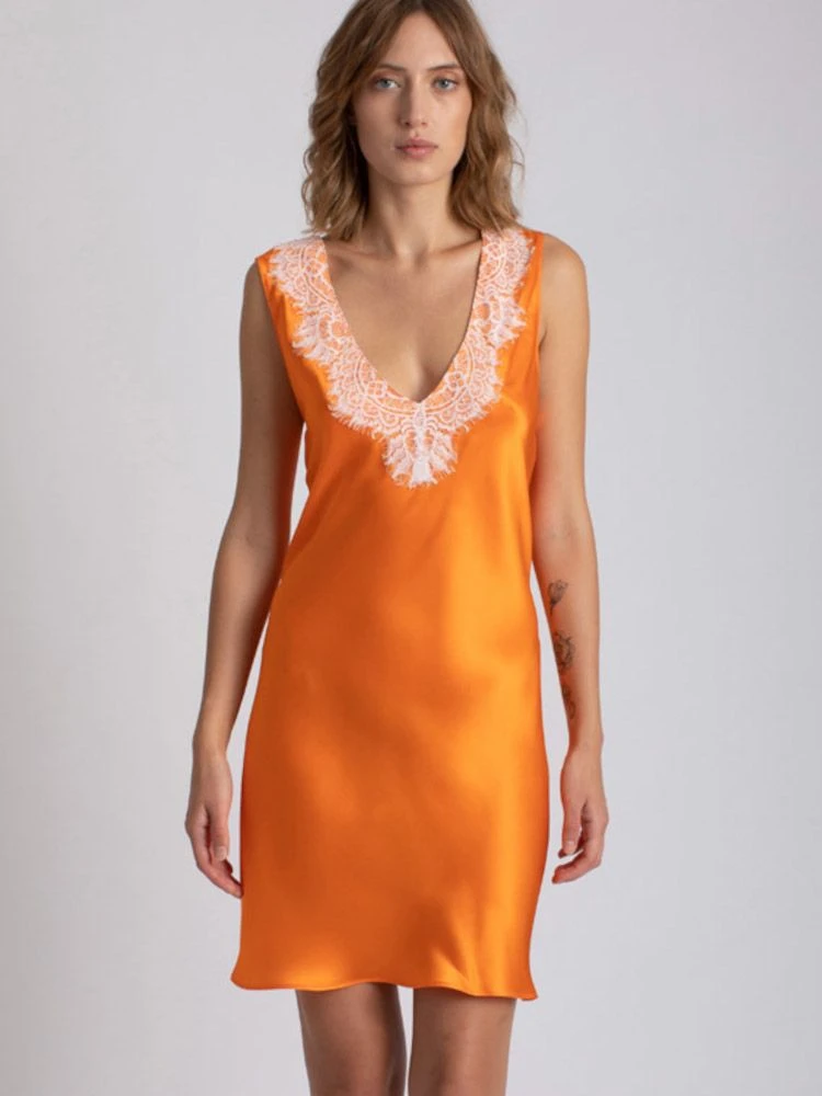 Dieses kurze Seiden-Negligé ist aus hochwertigem Seidensatin (100 % Seide) gefertigt. Das Seidennachthemd in fröhlichem Mandarine Orange hat einen V-Ausschnitt und breite Träger. Am Decolleté ist es mit elfenbein-weißer Eye Lash Spitze verziert.
