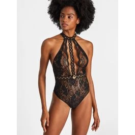 Der Body besteht vorne, sowie an den Seiten aus sehr feiner Leavers Spitze und ist daher leicht transparent. Über Taille, Hals und dem tief ausgeschnittenen Dekolleté zieht sich eine präzise Guipure Borte. Die Stelle an der die Borten von Taille und Dekolleté zusammentreffen ist durch ein Geflecht von goldenen Kettengliedern geziert. Der Rücken ist sehr tief ausgeschnitten und läuft kurz unter dem Steißbein V-förmig zu. Die elastischen Bänder, welche über den Rücken laufen, sind in Bondage-Optik und machen den Einteiler vollständig zu einem unwiderstehlichen Hingucker. Sowohl die feinen Guipure Borten, das offene Dekolleté, als auch der spektakuläre Rücken, enthüllen die Haut auf sinnliche Weise und verleihen dem Body eine erotische Note.