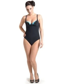 Der Badeanzug ist aus extra-weichem Feinjersey doppellagig gearbeitet und mit Makramee-Applikationen verziert. Es sind keine Cupgrößen ausgewiesen – der Badeanzug passt am Besten für B- bis C-Cup. Dieser Badeanzug ist in den Größen 34 bis 44 (deutsche Damengrößen) und den folgenden Farben erhältlich: