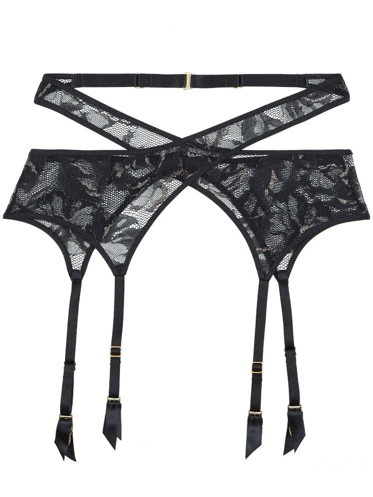 Der Gürtel besteht aus feiner Jacquard Spitze und ist daher leicht transparent. Die zarte Spitze ist mit goldenem Lurexgarn versehen und erhält somit einen aufregenden Schimmer. Der Gürtel wird gekreuzt getragen und je nach Look vorne oder hinten mit einem Häckchenverschluss geschlossen. Die Strapsbänder in Bondage-Optik sind elastisch und verstellbar. Goldene Schmuckringe und Verstellösen greifen die Eleganz der Kollektion wieder auf und machen somit aus diesem Taillengürtel einen erotischen Hingucker.
