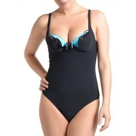 Der Badeanzug ist aus hochwertigem Feinjersey gearbeitet. Im Bereich des Decolletes ist er kontrastierend in leuchtendem türkis abgefüttert und mit Rüschen gestaltet. Außerdem sind hier Details aus Lack-Look Material und eine gefütterte Schleife aufgesetzt, was aus dem ansonsten schlicht schwarzen Badeanzug etwas ganz besonderes macht. Der Badeanzug ist mit B-Cup in den Größen 36 bis 44 (deutsche Damengrößen) in der Farbe schwarz mit türkis erhältlich.