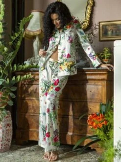 Dieser leichte Morgenmantel hat einen ausgefallenen Druck mit Palmblättern in Natur- und Beige-Tönen mit Sand-Gelb. Er ist für die warme Jahreszeit geeignet und kann als Homewear oder Beachwear getragen werden.